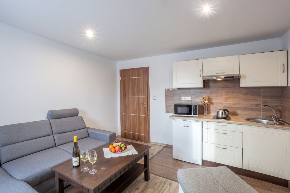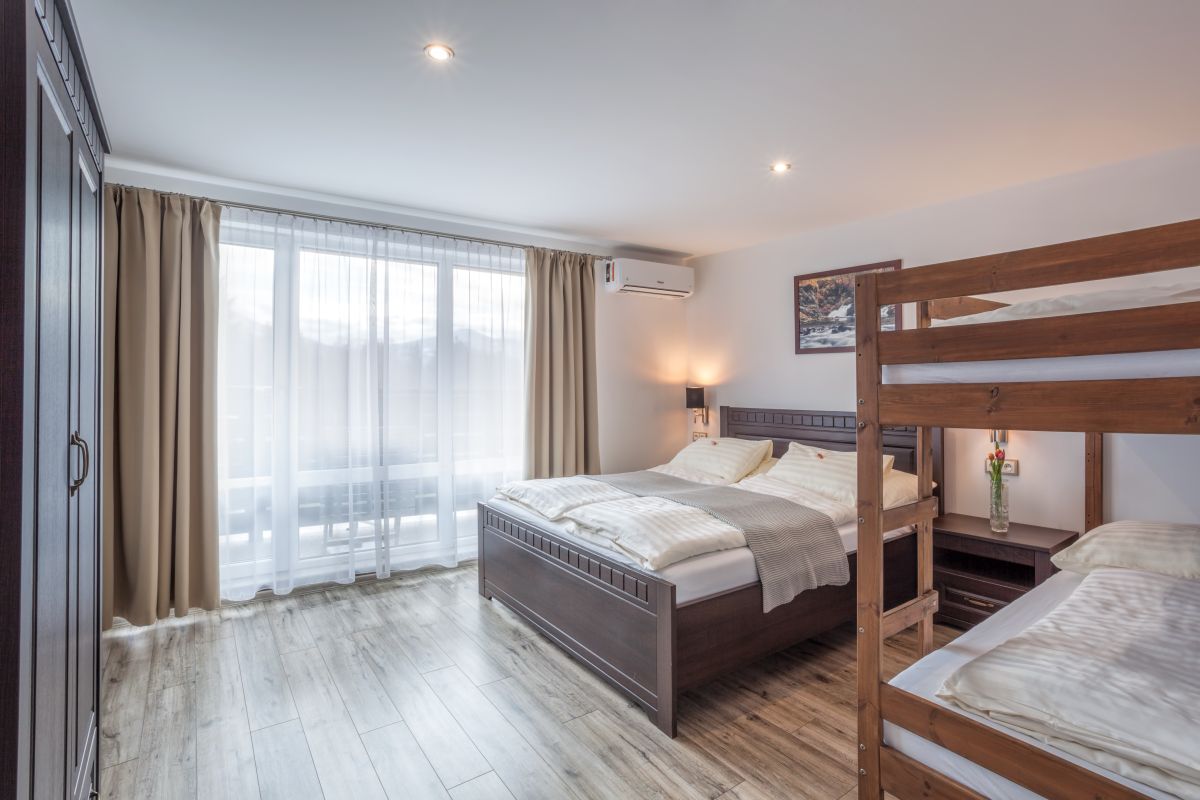 Apartmán se skládá z ložnice s manželskou postelí a poschoďovou postelí, z obývacího Pokoje s koupelnou